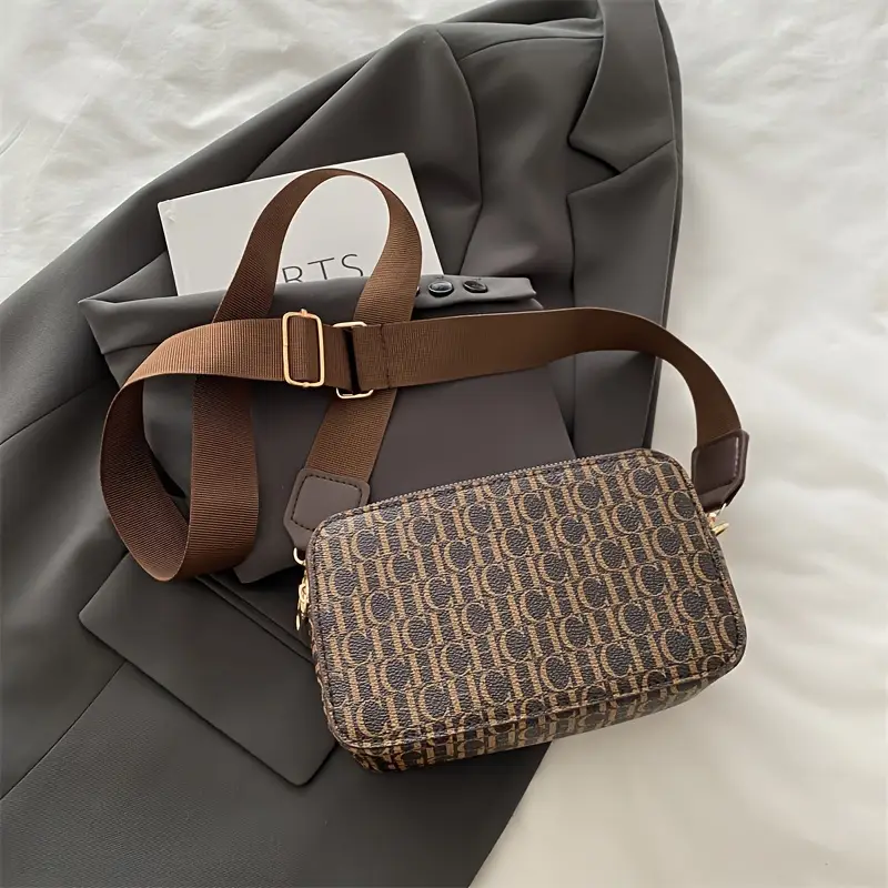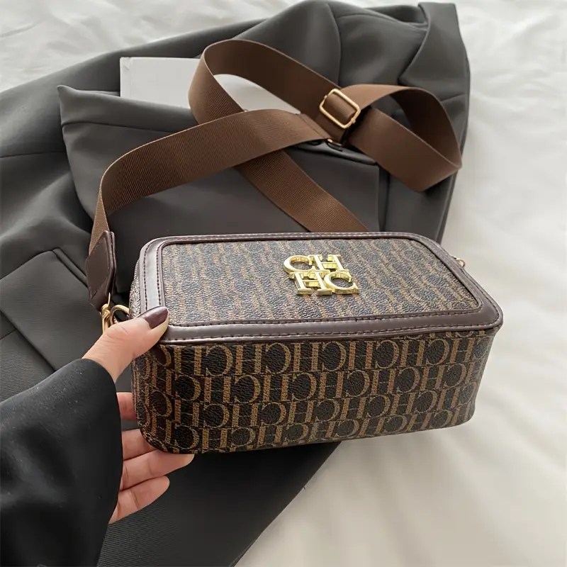 Bolso cruzado de cuero sintético con estampado de letras en marrón y dorado CHC – Elegante cartera de hombro para mujer con correa ajustable, gran capacidad para uso diario, bolso bandolera
