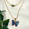 Este encantador collar doble con mariposas tornasol en baño de oro 18K combina delicadeza y movimiento en una sola pieza. Sus alas reflejan la luz con tonos iridiscentes que cambian según el ángulo, creando un efecto mágico y lleno de vida. Perfecto para looks frescos y románticos.