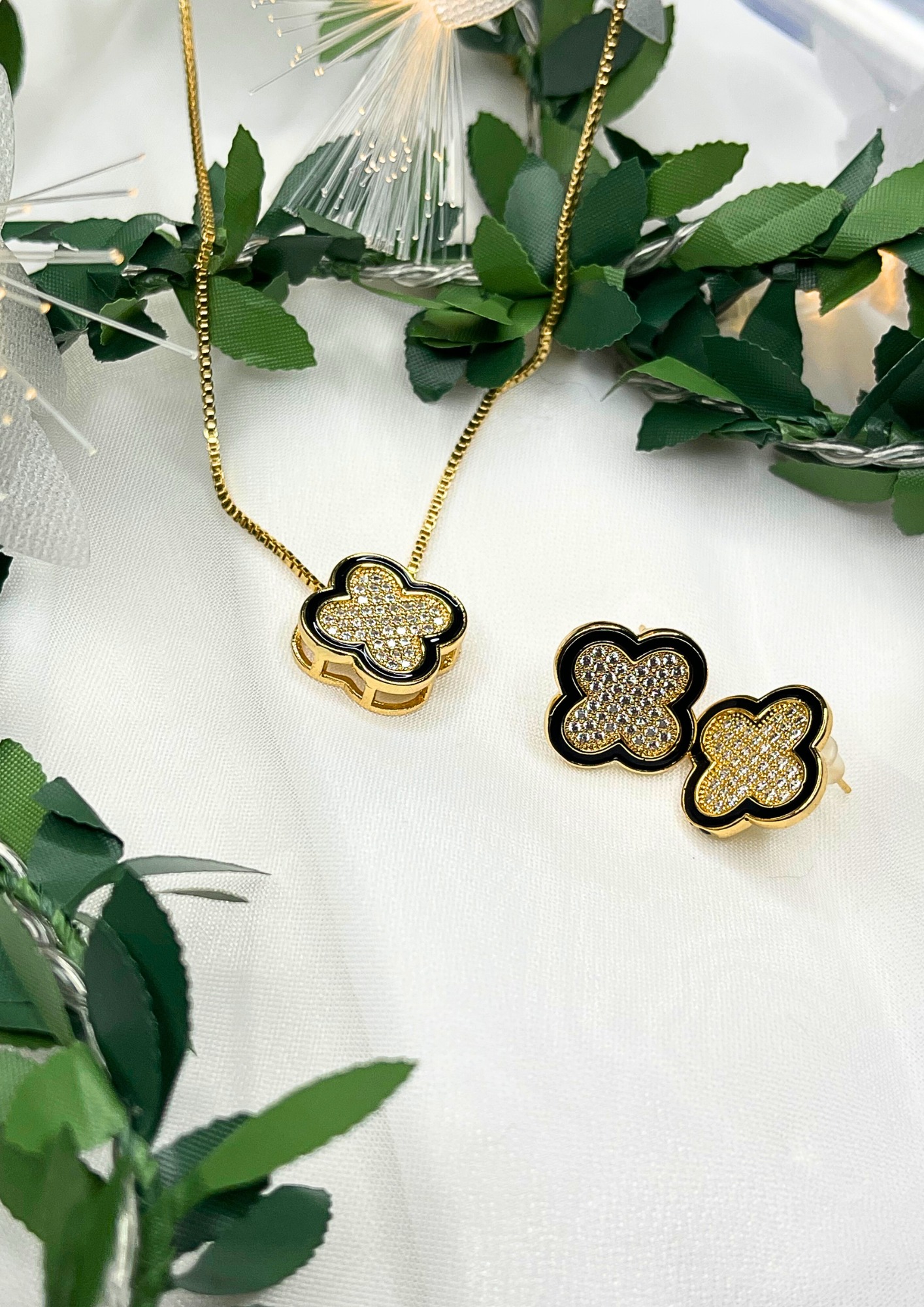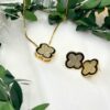 Este exclusivo combo inspirado en Van Cleef, con acabado dorado y bordes negros, es el equilibrio perfecto entre sofisticación y modernidad. Cada pieza —ya sea pulsera, collar o aretes— resalta por su diseño icónico en forma de trébol, ideal para lucir en conjunto o por separado.